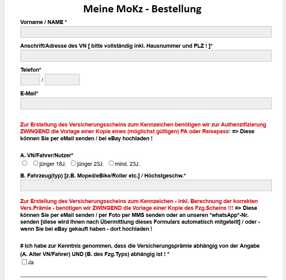# Für Ihre Bestellung bieten sich Ihnen hier 3 Wege: __________________________________________________ II. Der einfachste und schnellste Weg [!!!] => Einfach "Allgemeine Bestellung" per Telefon 02630 - 8380082 oder mit folgendem Bestell-Formular - oder- III. Sie laden sich den jeweiligen Antrag - für den vorläufigen Versicherungsschutz - [ ACHTUNG! Deckung erst ab Eingang des vollständig ausgefüllten Antrags UND der fälligen Versicherungsprämie ! ] - direkt hier herunter ! > Bitte möglichst völlständig ausfüllen ( vorallem inkl. Rückruf-Nr.! ) und dann per eMail (als 'Scan') oder per FAX (an 02630-1557) oder per Post (an: "K+R Vers,Kontor - PF 1430 - 56210 Mülheim-Kärlich") senden! >>> Antragsformular DOWNLOADEN für VN/Fahrer/Nutzer = mind. (vollendet) 23J. alt! >>> Antragsformular DOWNLOADEN für VN/Fahrer/Nutzer = noch nicht 23J. alt! [ACHTUNG! Download bitte möglichst bei guter Verbindung durchführen - größere Datei (>1MB!)] >>> Antragsformular für VN/Fahrer/Nutzer bis zum 18. Geburtstag!